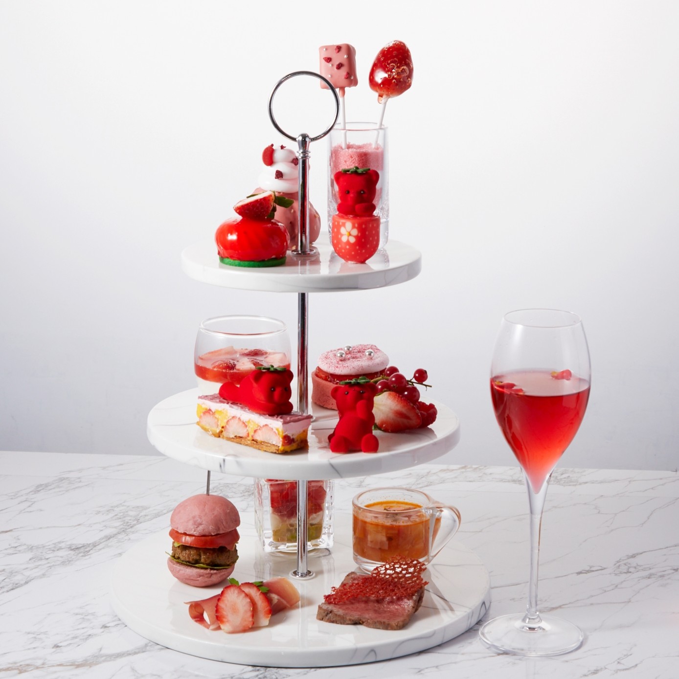 国産ブランド苺とそのスイーツ、赤とピンクに仕上げたセイボリーを