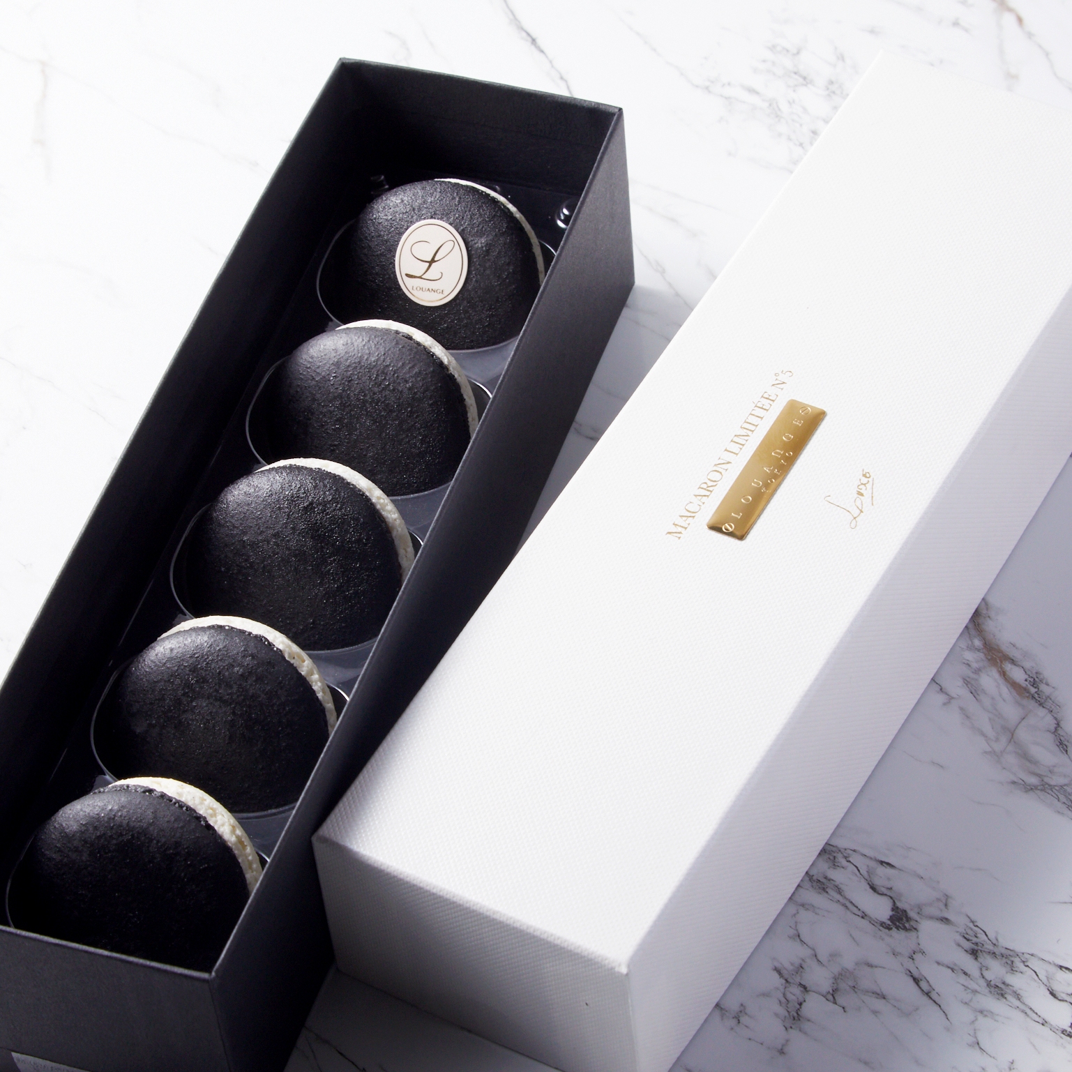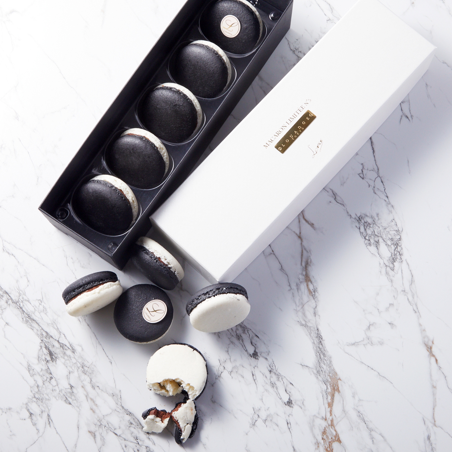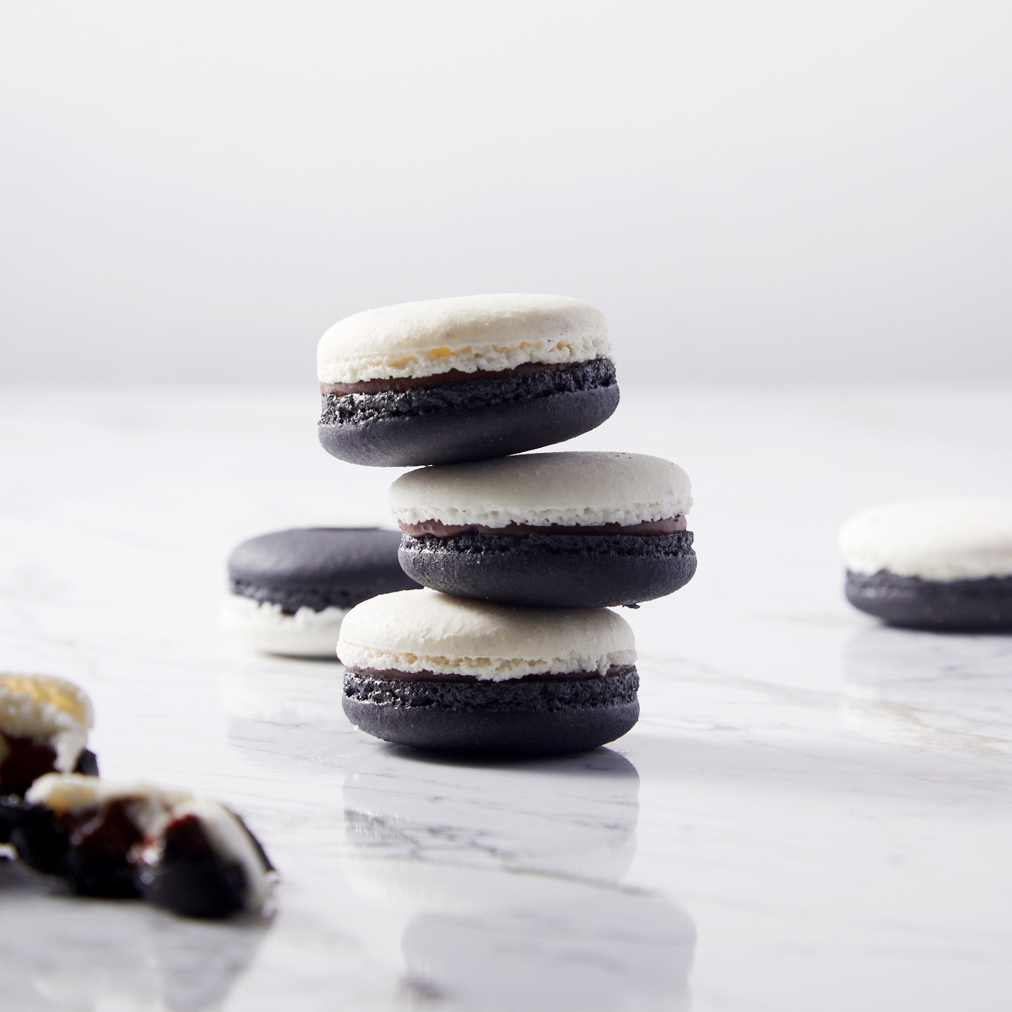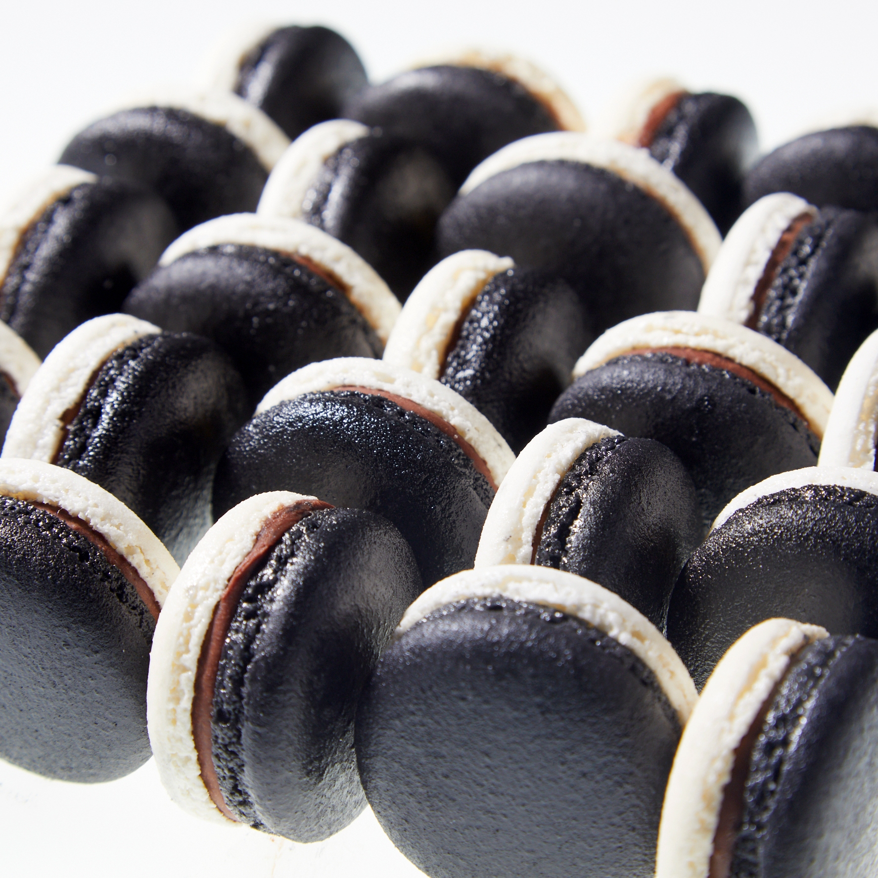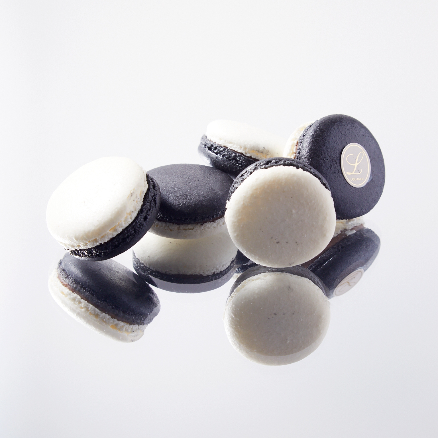 スペイン産の黒トリュフ香るガナッシュと、リコッタチーズガナッシュの二層仕立てのアミューズマカロン