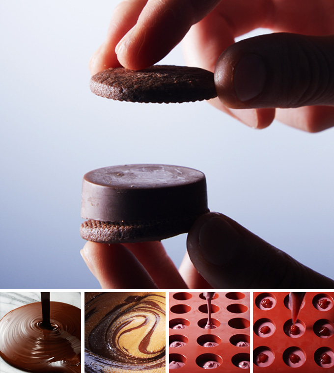 チョコレートの中に様々なコフィチュールやクリームを入れることで味の変化や食感の変化を楽しんで頂けます。