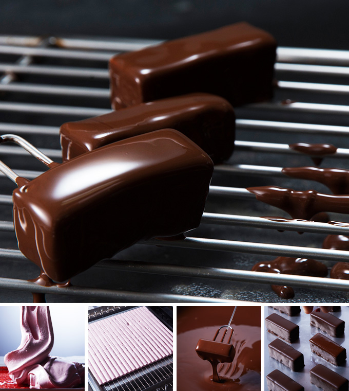ギモーブの美味しさと食感をチョコレートで包み込む。 外はパリッと中はモチっとを実現するためにチョコレートでコーティングします。