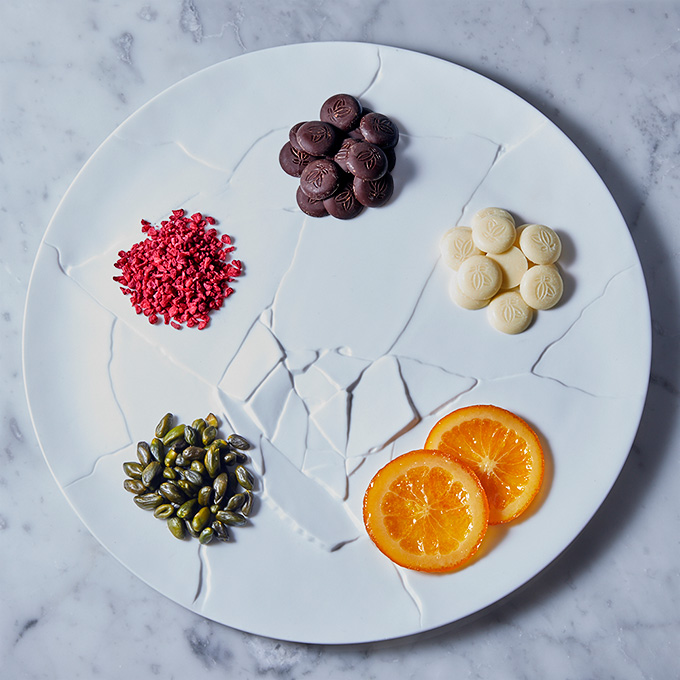オレンジ、砂糖、水飴、カカオマス、カカオバター、アーモンド、ピスタチオ、フランボワーズ、乳化剤【大豆由来】